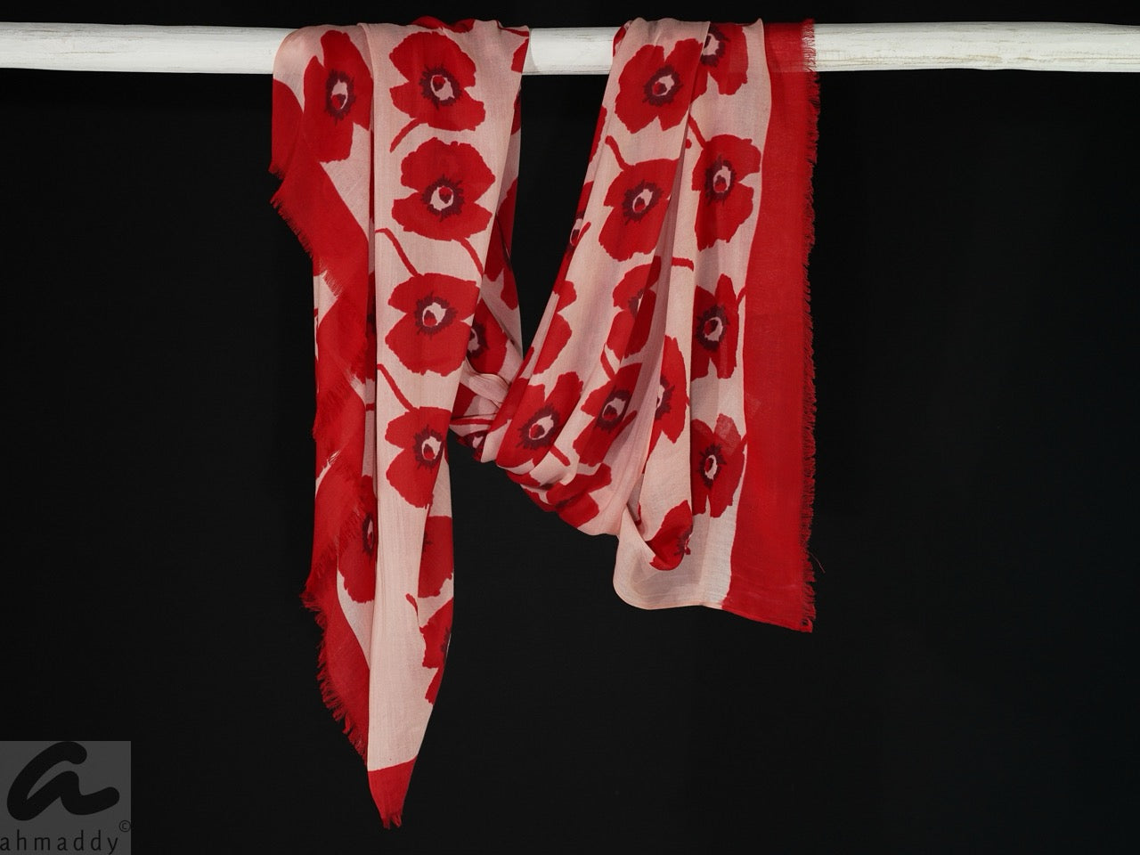 Wunderschöner Schal mit Mohnblüten aus 100 % feiner Baumwolle in den Farben rosa und rot. Größe 100 x 200 cm.